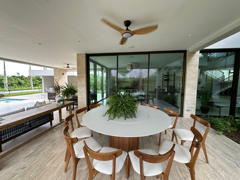 -Terraza en L con área social hacia la piscina y comedor informal
