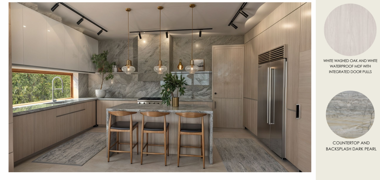 Muebles de cocina con acabados en roble blanco lavado y MDF blanco hidrófugo con tiradores de puerta integrados y encimera de cuarzo.